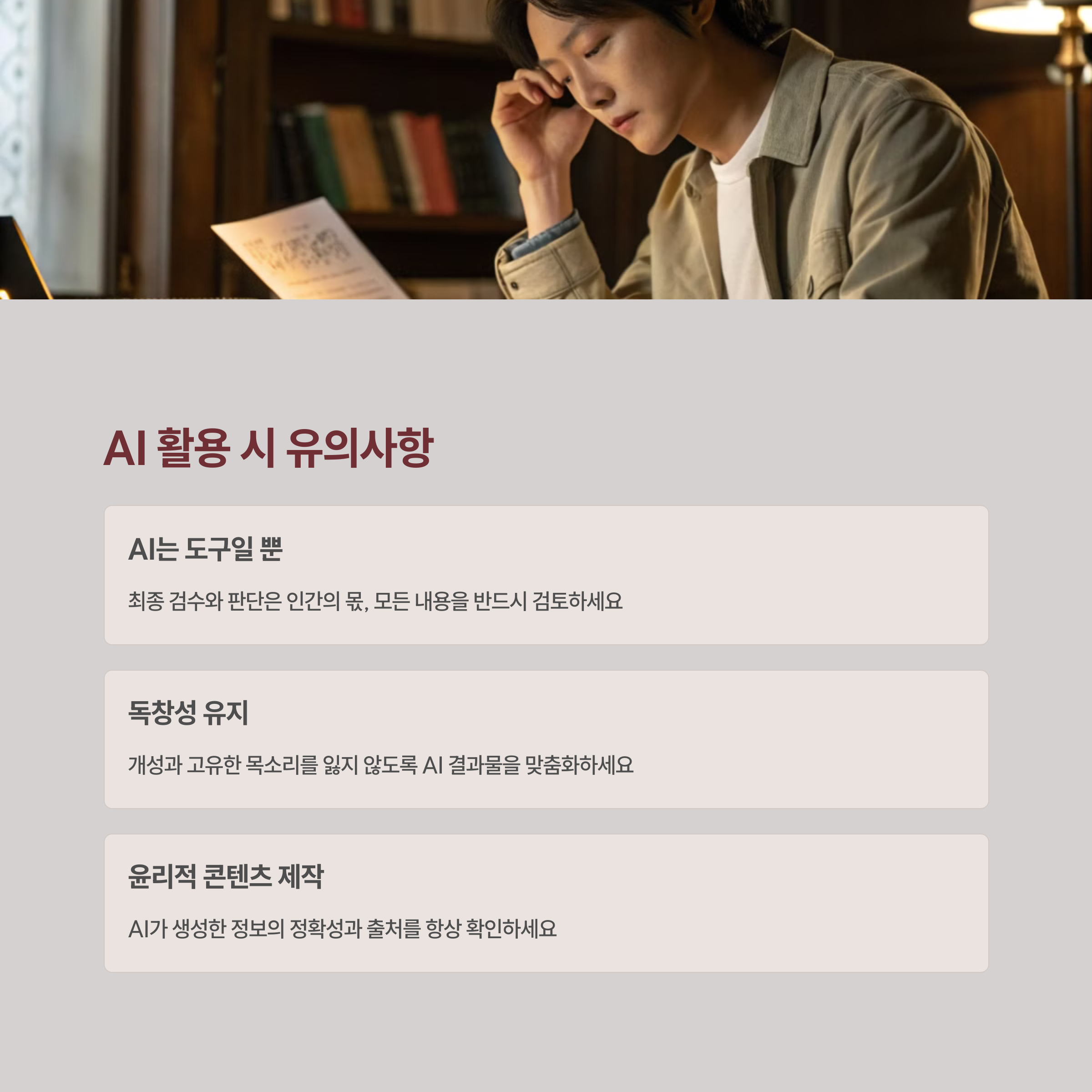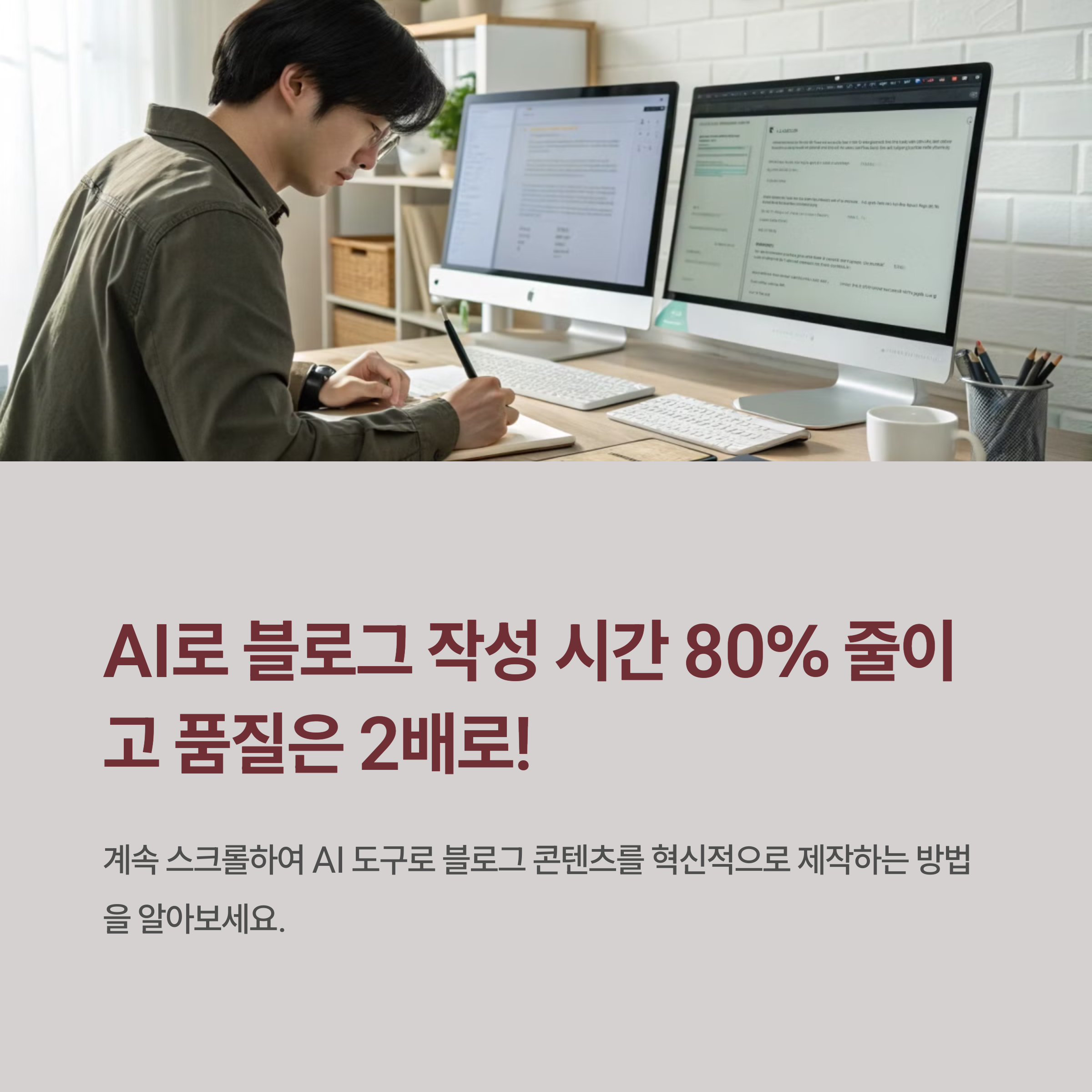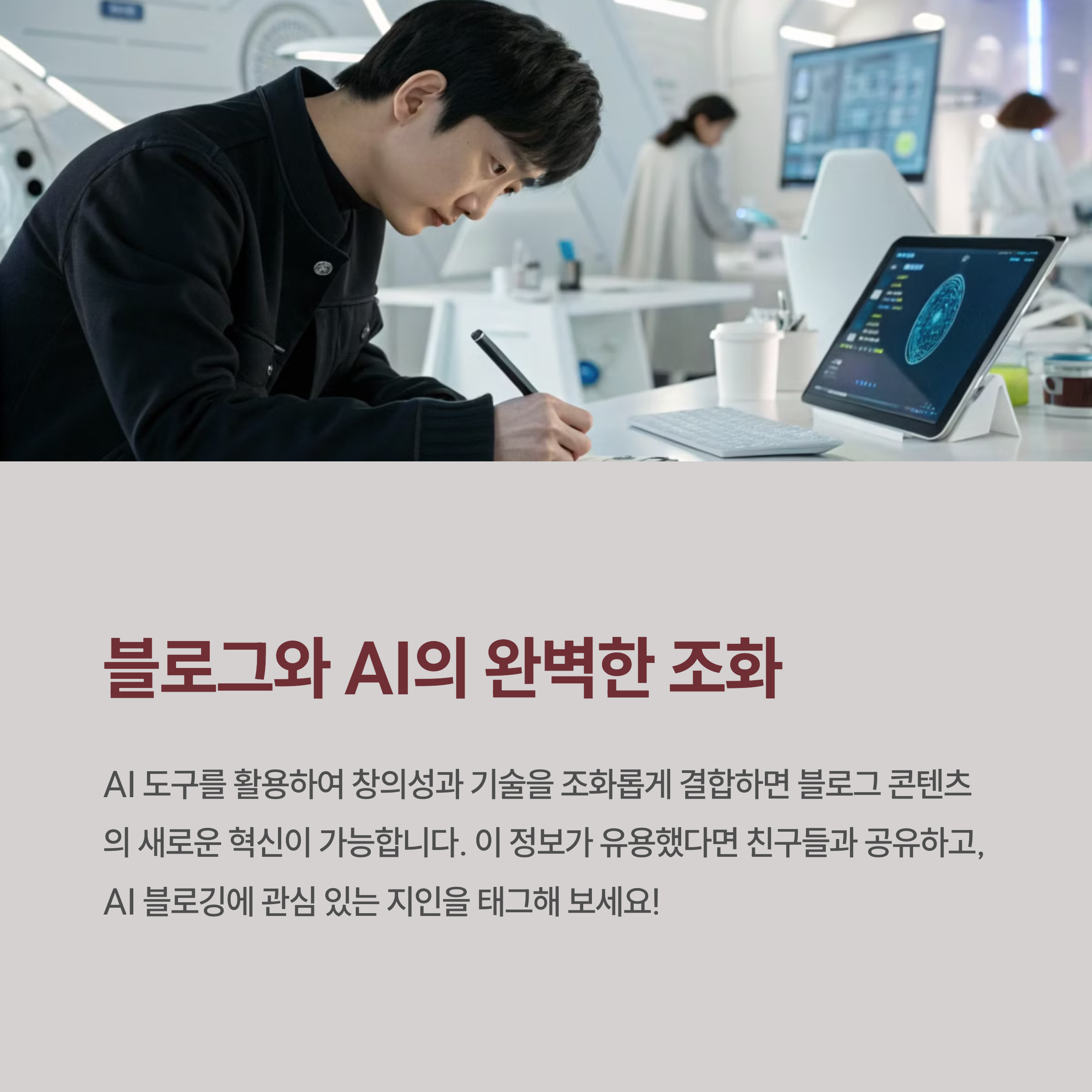 블로그 글쓰기는 혼자 하는 외로운 작업이 아닙니다. AI가 당신의 비서가 되고, 편집자가 되며, 디자이너가 되어줍니다. 중요한 건 툴을 쓰는 것이 아니라 어떤 방향으로 쓰느냐입니다. 오늘부터 단 하나의 도구라도 실전에 적용해보세요. 분명히 체감되는 변화가 생길 것입니다.