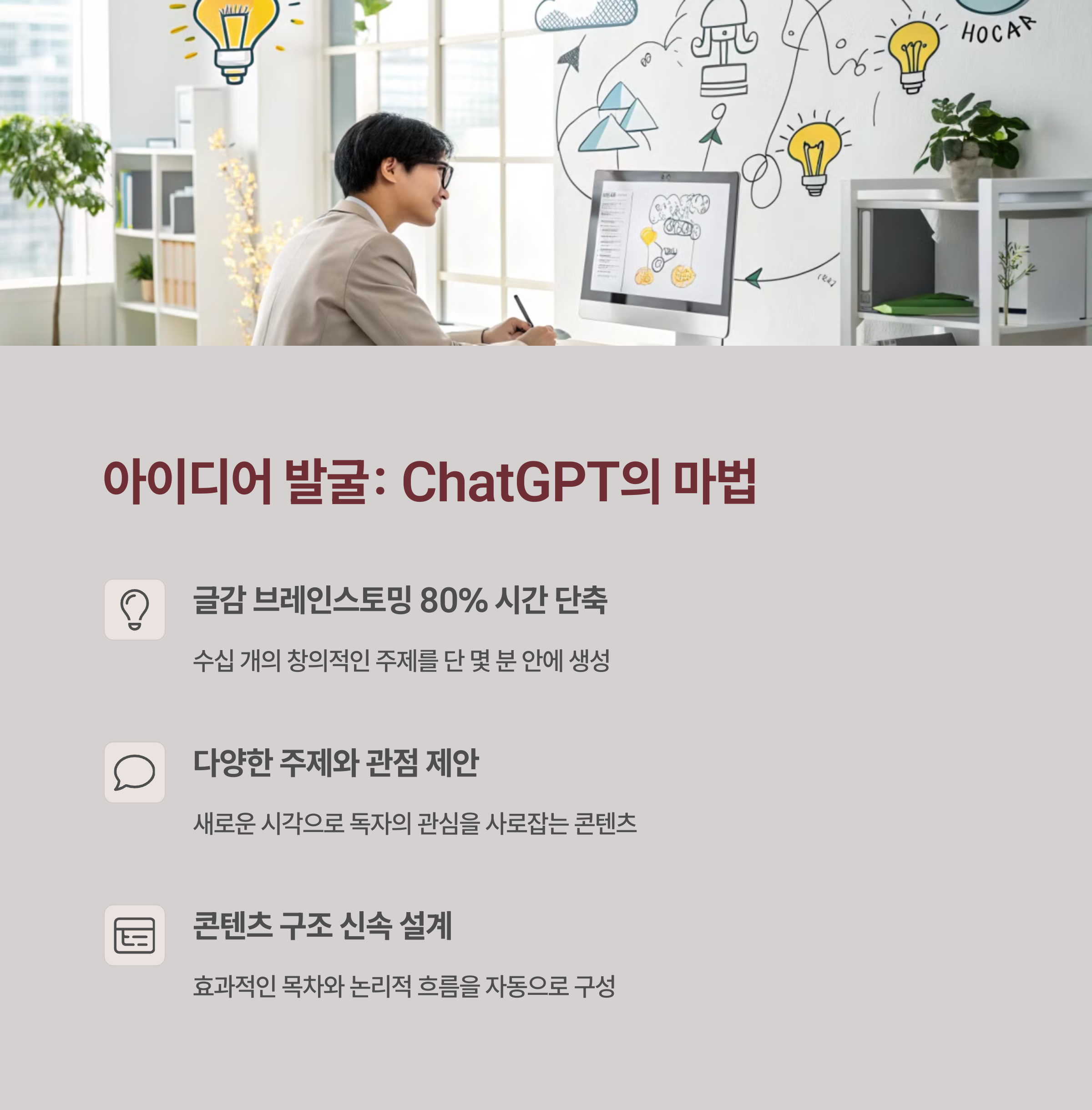 블로그 글쓰기는 생각보다 많은 에너지를 요구합니다. 주제를 고민하고, 초안을 쓰고, 문장을 다듬고, 이미지까지 만들어야 하죠. 하지만 ChatGPT를 활용하면 주제 아이디어부터 도입부, 구성안, 심지어는 전체 초안까지 빠르게 생성할 수 있습니다. Notion AI를 연결해 정리, 요약, 재작성을 반복하면서 훨씬 자연스럽고 깔끔한 글이 만들어지죠. 저는 이 두 툴만으로 하루 2시간 이상을 절약하고 있습니다.