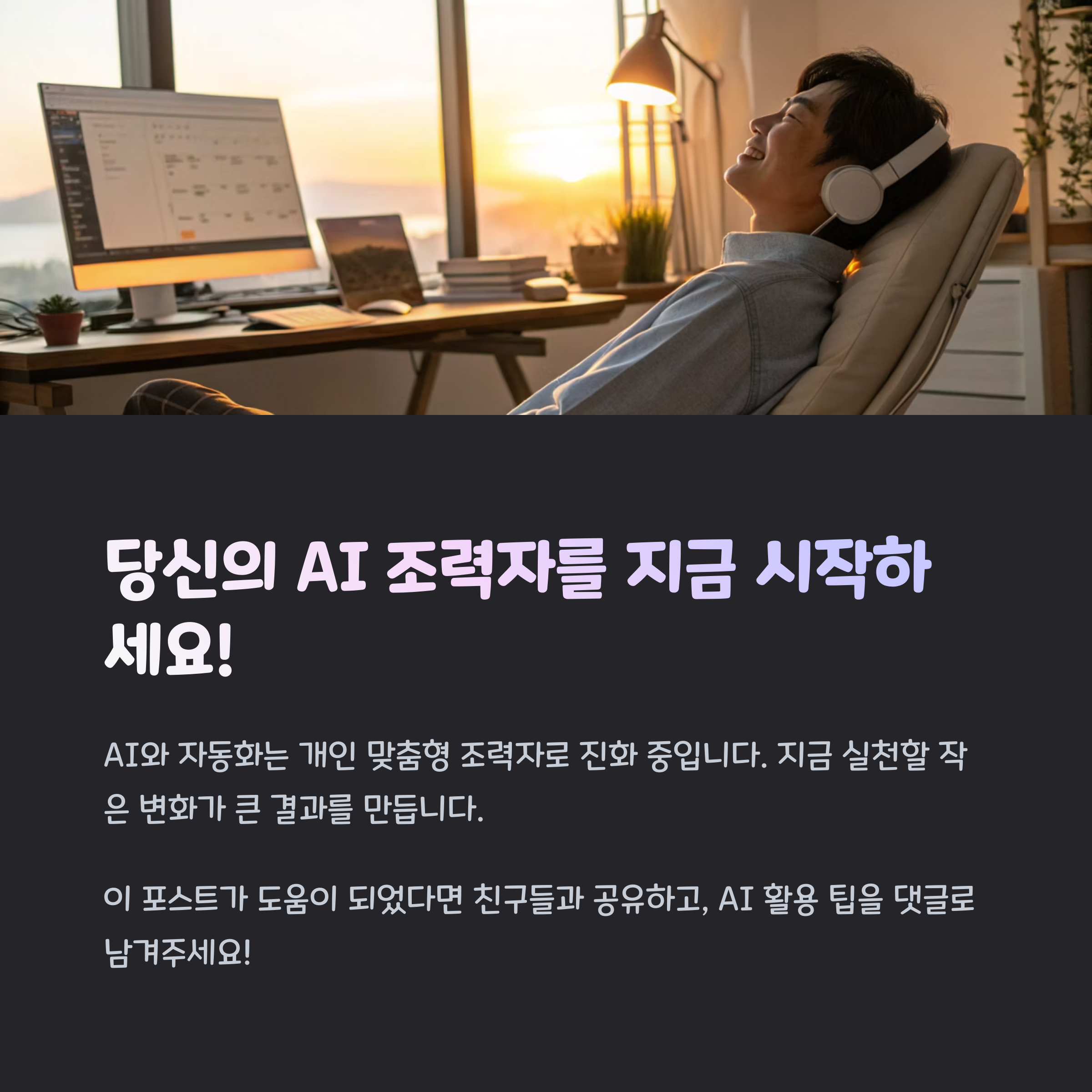 AI와 자동화는 더 이상 선택이 아닌 생존의 기술입니다. 하지만 그것이 어렵고 복잡한 시스템이 아닌 우리 삶 속에 자연스럽게 스며들 수 있다는 점이 매우 중요합니다. 이 글에서 소개한 브레인 자동화는 개인 맞춤형 AI 루틴을 통해 우리가 더 나은 결정을 내리고, 더 큰 창의성을 발휘하며, 시간을 절약하고 에너지를 집중할 수 있도록 도와줍니다. 기술은 도구에 불과하지만, 그 도구를 ‘어떻게’ 쓰느냐가 우리의 일상을 얼마나 바꿀 수 있는지를 결정합니다. 여러분도 오늘부터 작은 습관 하나씩 AI에 맡겨보세요. 새로운 미래가 곧 여러분 앞에 펼쳐질 것입니다.