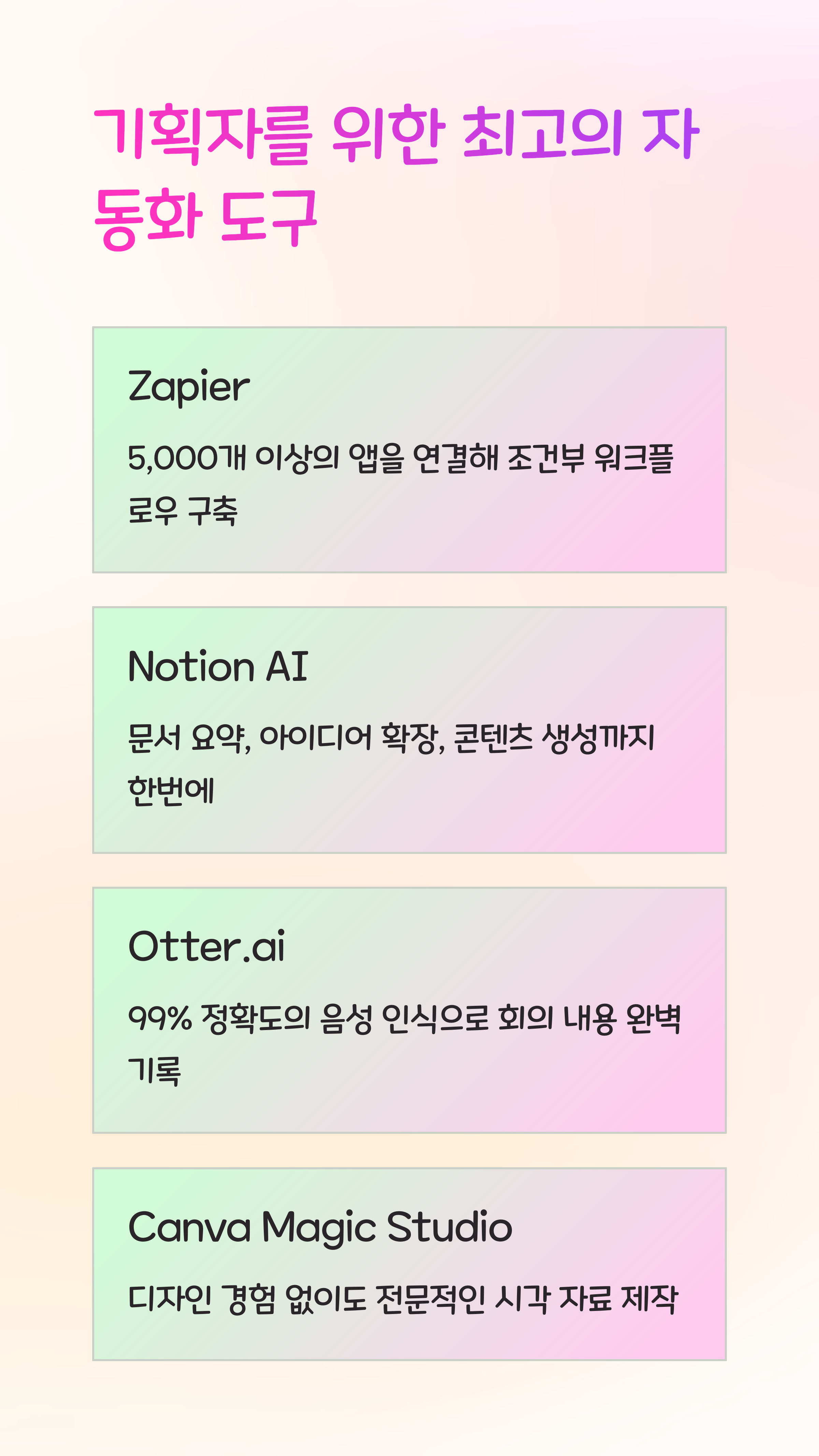 | 왜 기획자에게 필요할까? | 아이디어 설계와 전략에 집중할 수 있는 시간을 확보하기 위함입니다. |