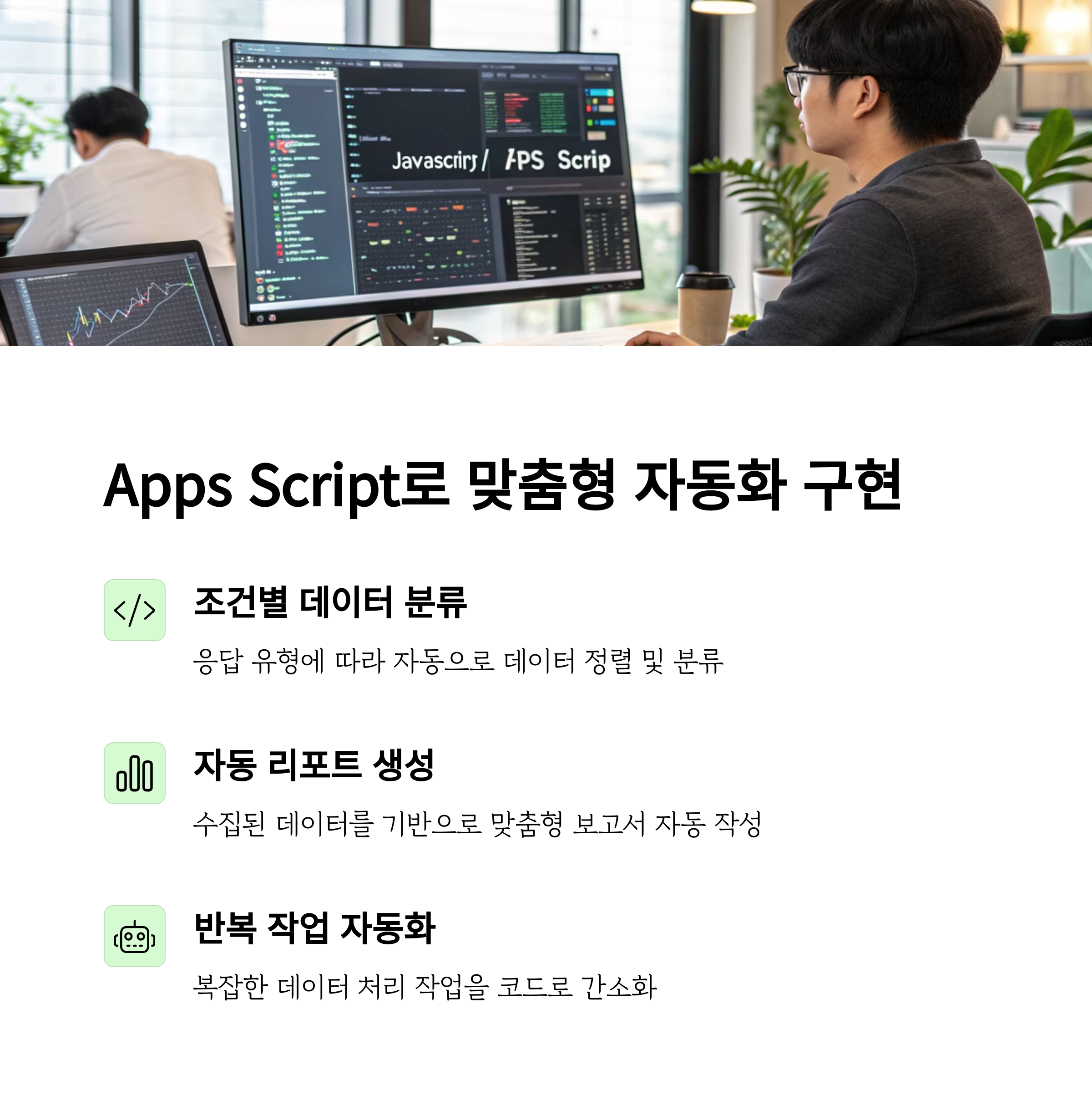 더 정교한 자동화를 원한다면 Google Apps Script를 사용할 수 있습니다. 예를 들어 특정 항목에 체크된 응답만 다른 시트에 복사하거나, 응답 시간에 따라 자동 필터링, 조건부 서식 지정, PDF 리포트 자동 생성까지 가능합니다. Apps Script는 자바스크립트 기반이며, 구글 시트 상단 ‘확장 프로그램 → Apps Script’ 메뉴에서 직접 작성 및 실행할 수 있습니다. 반복되는 분석 및 리포트 작성 시간을 크게 줄여주는 강력한 자동화 엔진입니다.