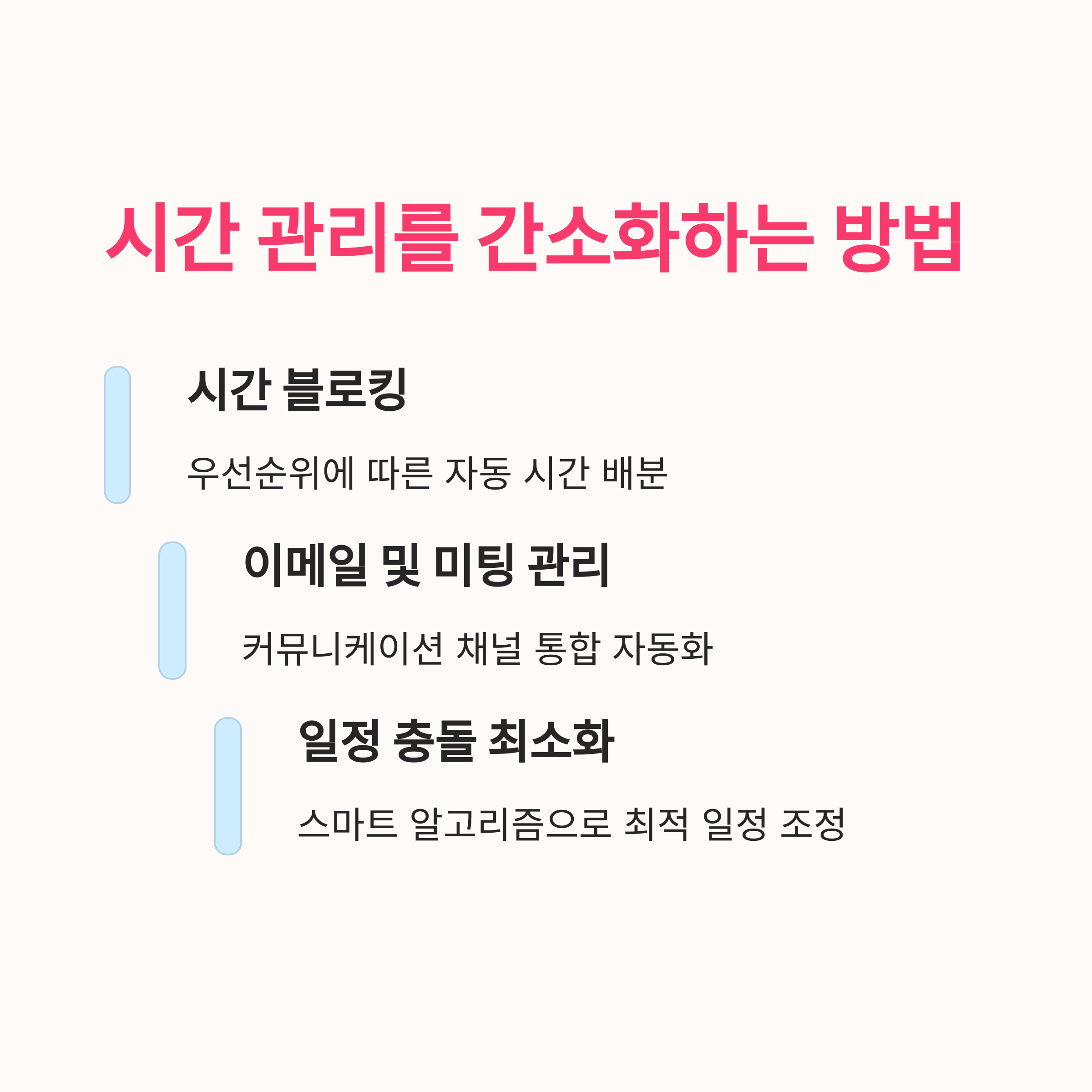 | 일정 자동 조율이 필요한 이유 | 수동 조율은 피로감을 유발하고, 커뮤니케이션 비용을 증가시킵니다. 자동화는 시간 절약과 실수 방지 모두에 효과적입니다. |