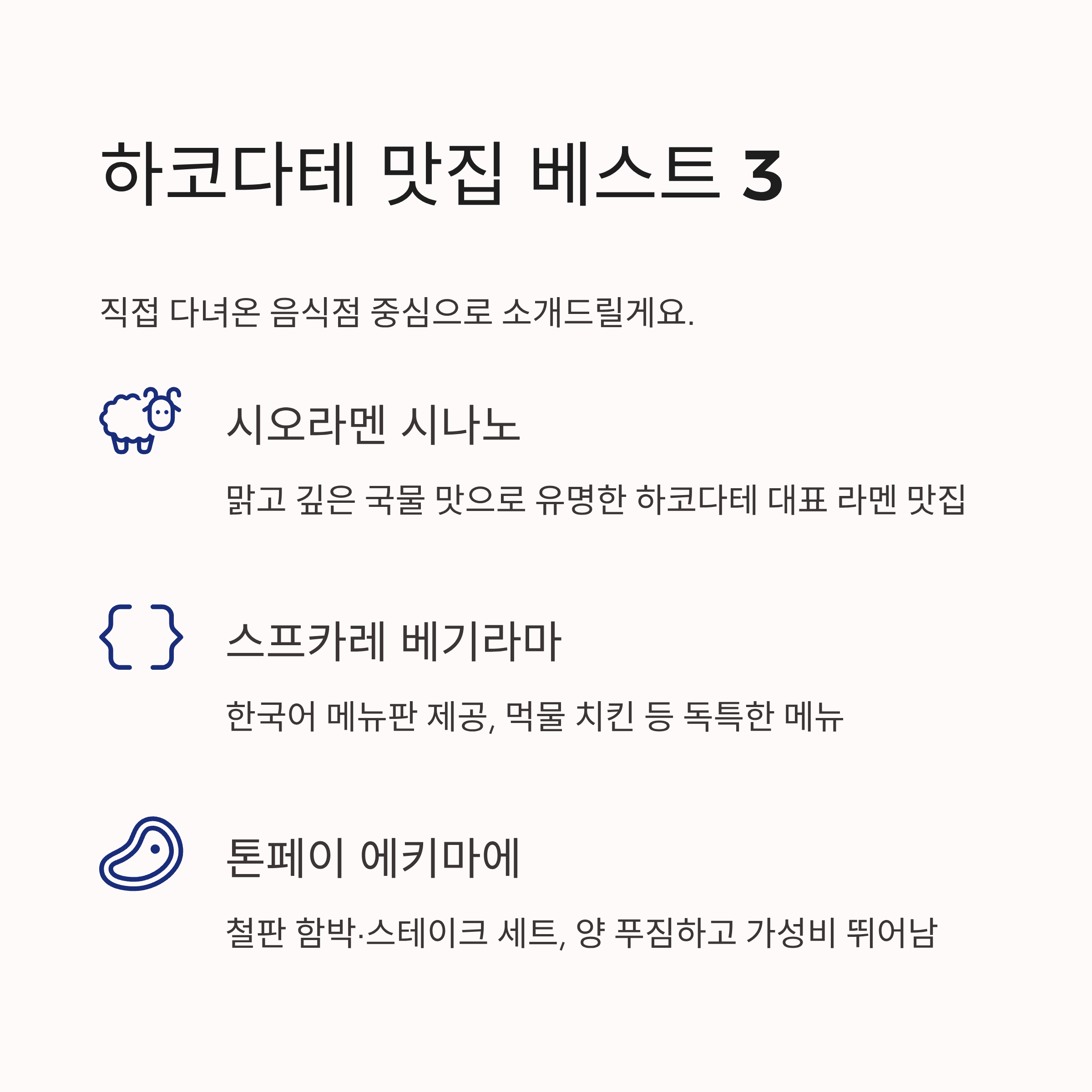 하코다테에서는 라멘, 스프카레, 철판 스테이크까지 다양한 맛집이 기다리고 있습니다. 직접 다녀온 음식점 중심으로 소개드릴게요.