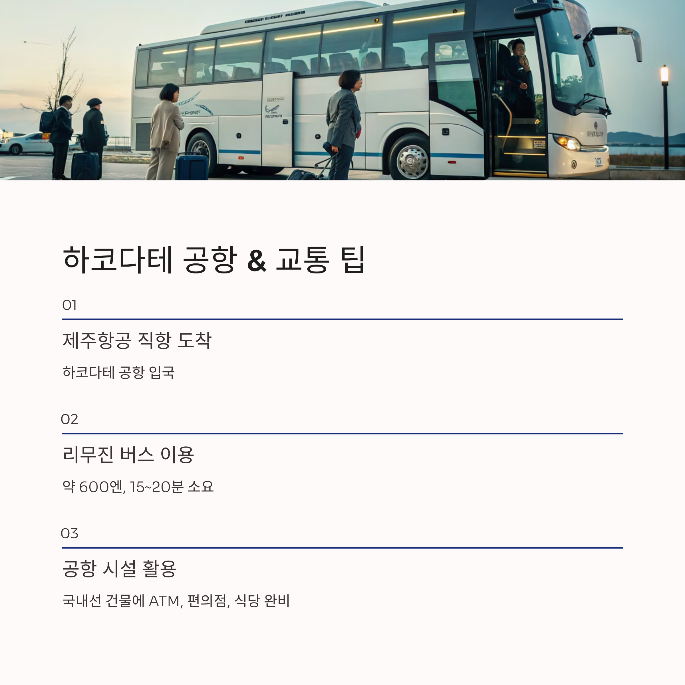 제주항공 직항으로 하코다테 입국 시, 공항에서 시내까지는 리무진 버스(약 600엔)로 15~20분 소요됩니다. 국내선 건물에 ATM, 편의점, 식당 등이 있으니 참고하세요.