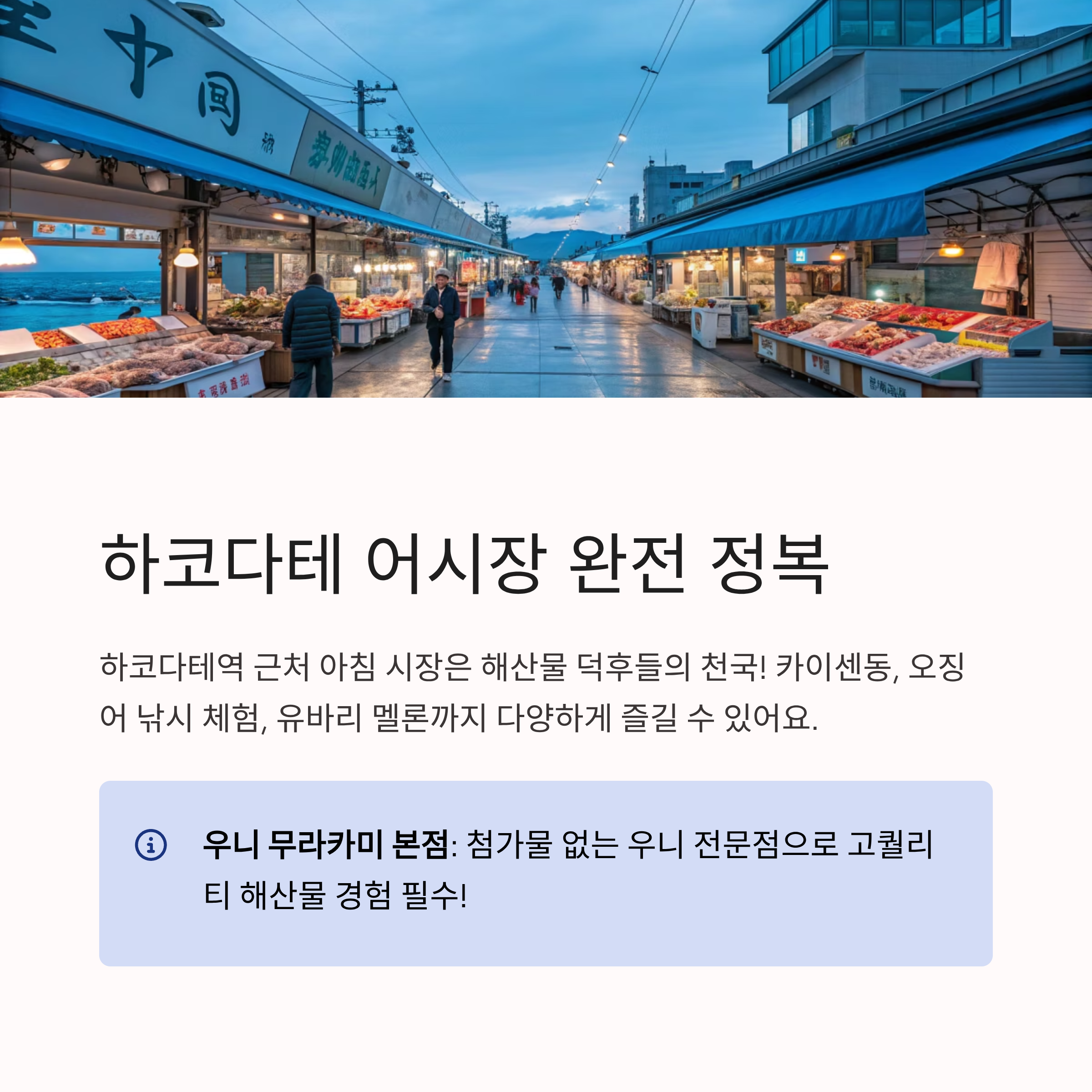 하코다테역 근처에 위치한 아침 시장은 해산물 덕후들에게 천국입니다. 카이센동, 오징어 낚시 체험, 유바리 멜론까지 다양하게 즐길 수 있어요.