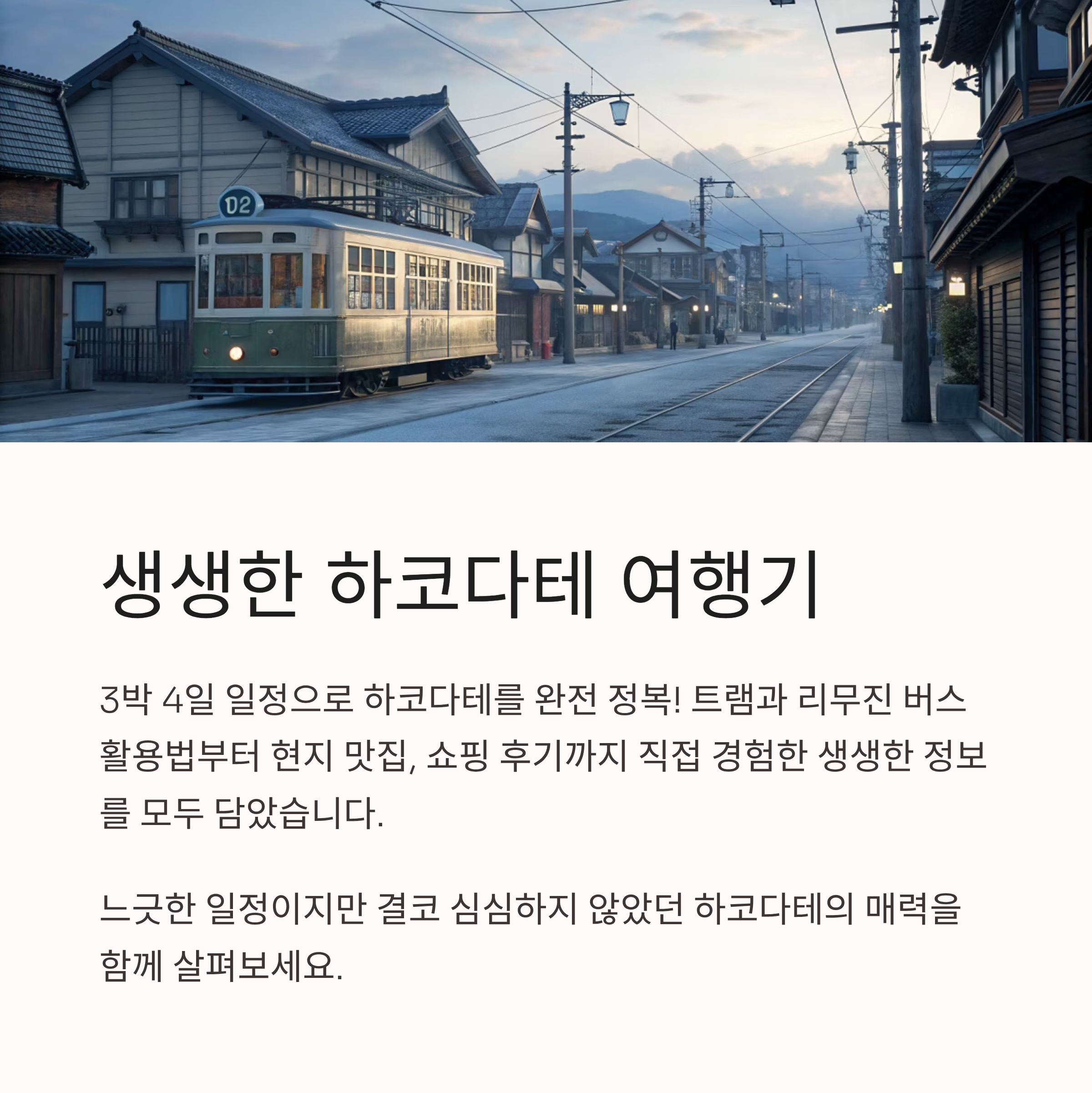 다가오는 겨울이나 봄 시즌에 다시 한 번 방문하고 싶은 여행지로 마음에 깊이 남았습니다. 하코다테, 한 템포 느린 여행이 주는 여유로움을 느껴보세요.