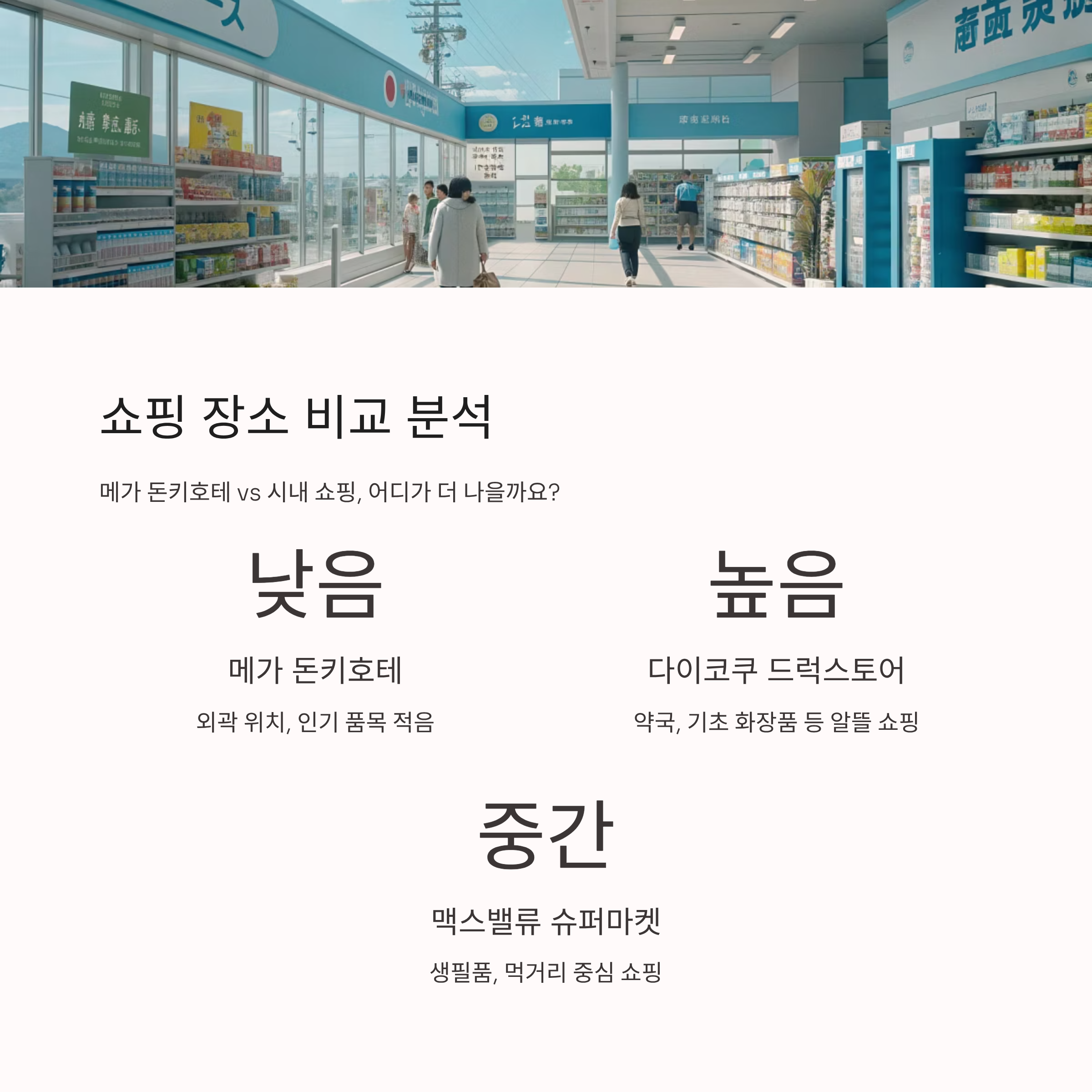 | 메가 돈키호테 | 낮음 | 외곽 위치, 인기 품목 적음 |
