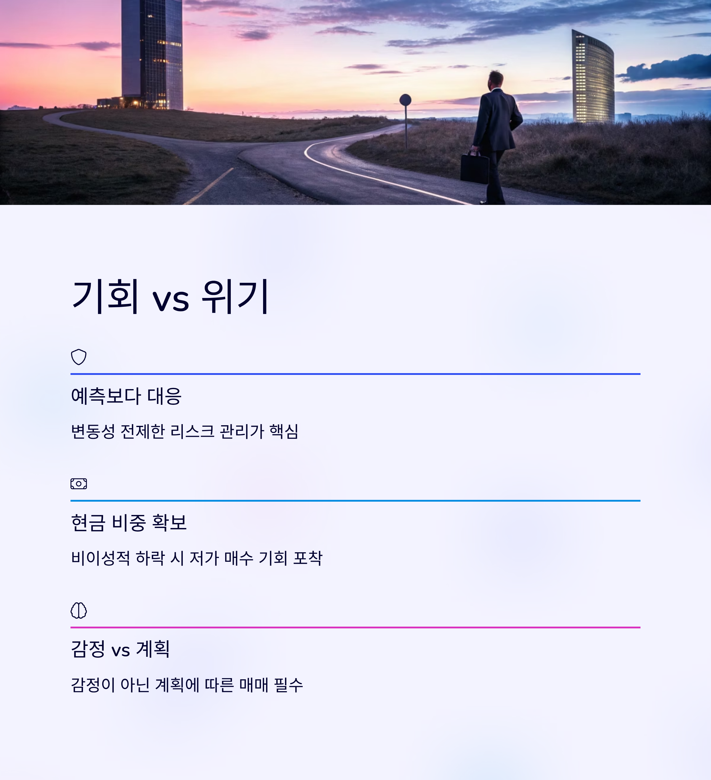 현금 비중을 확보하고, 비이성적 하락이 나타난다면 '저가 매수'의 기회로 삼는 것도 한 방법입니다. 하지만 이 모든 전략에는 한 가지 조건이 있습니다. 감정이 아닌 계획에 따른 매매여야 한다는 것입니다.