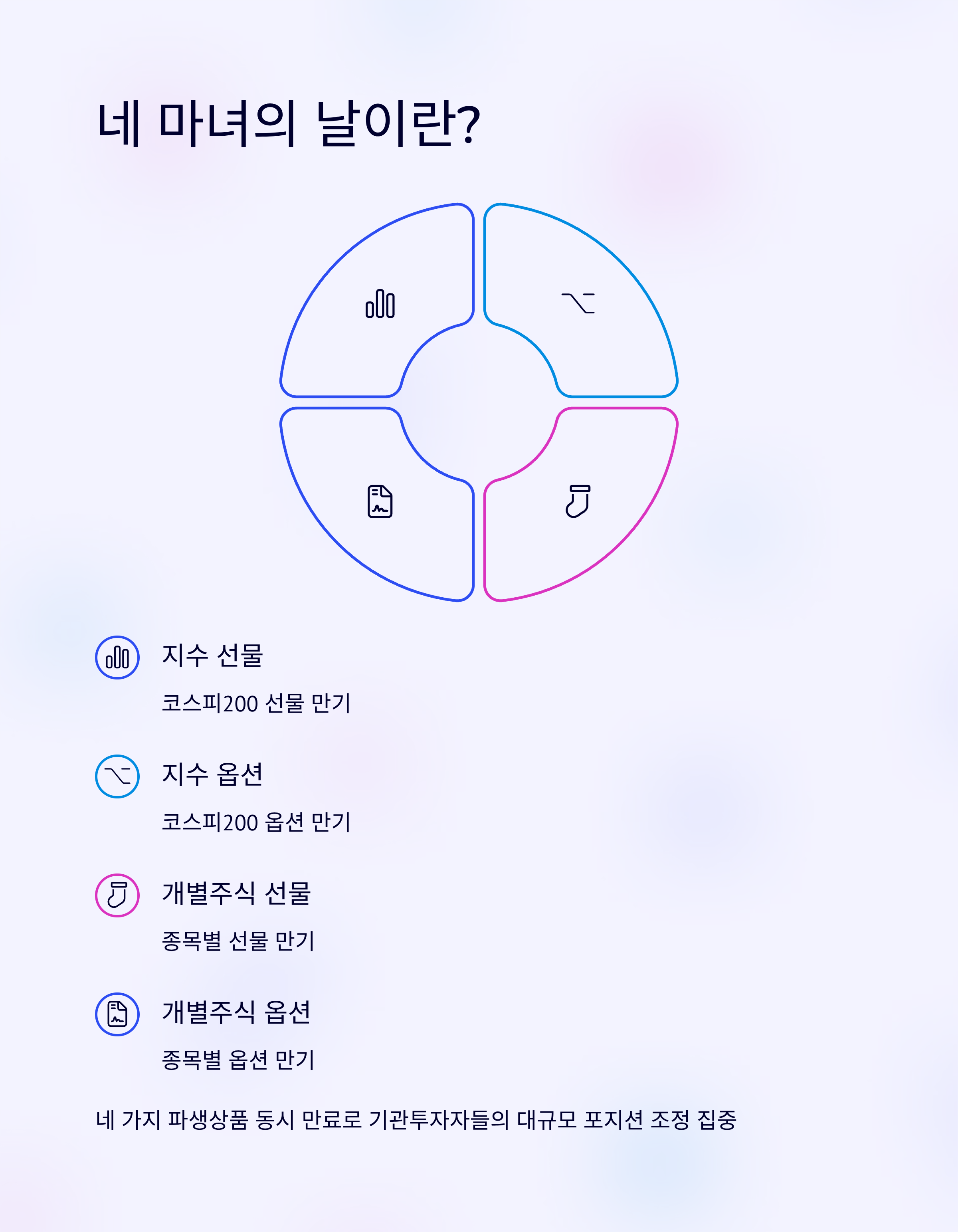 '네 마녀의 날(Quadruple Witching Day)'은 네 가지 파생상품인 지수 선물, 지수 옵션, 개별주식 선물, 개별주식 옵션이 동시에 만기되는 날을 의미합니다. 네 개의 상품이 한꺼번에 만기되다 보니, 기관 투자자들의 대규모 포지션 조정이 집중됩니다. 이로 인해 단시간에 주가가 급등락하며 시장 전체가 혼란에 빠지곤 합니다.