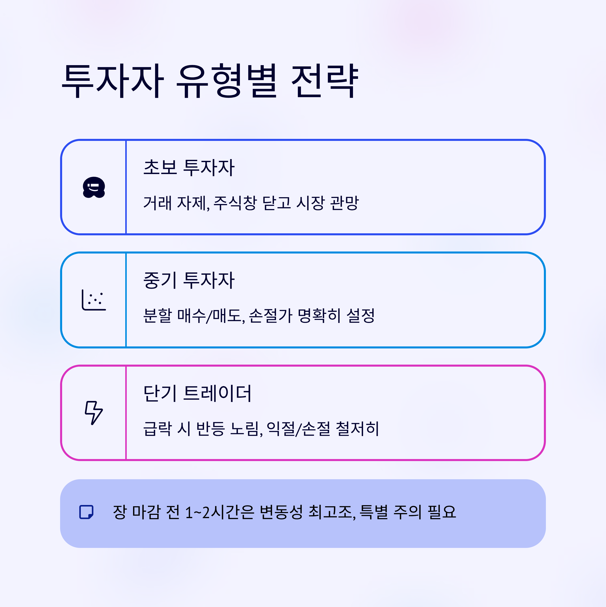 | 스윙·중기 투자자 | 분할 매수/매도 고려 | 손절가 명확히 설정 |