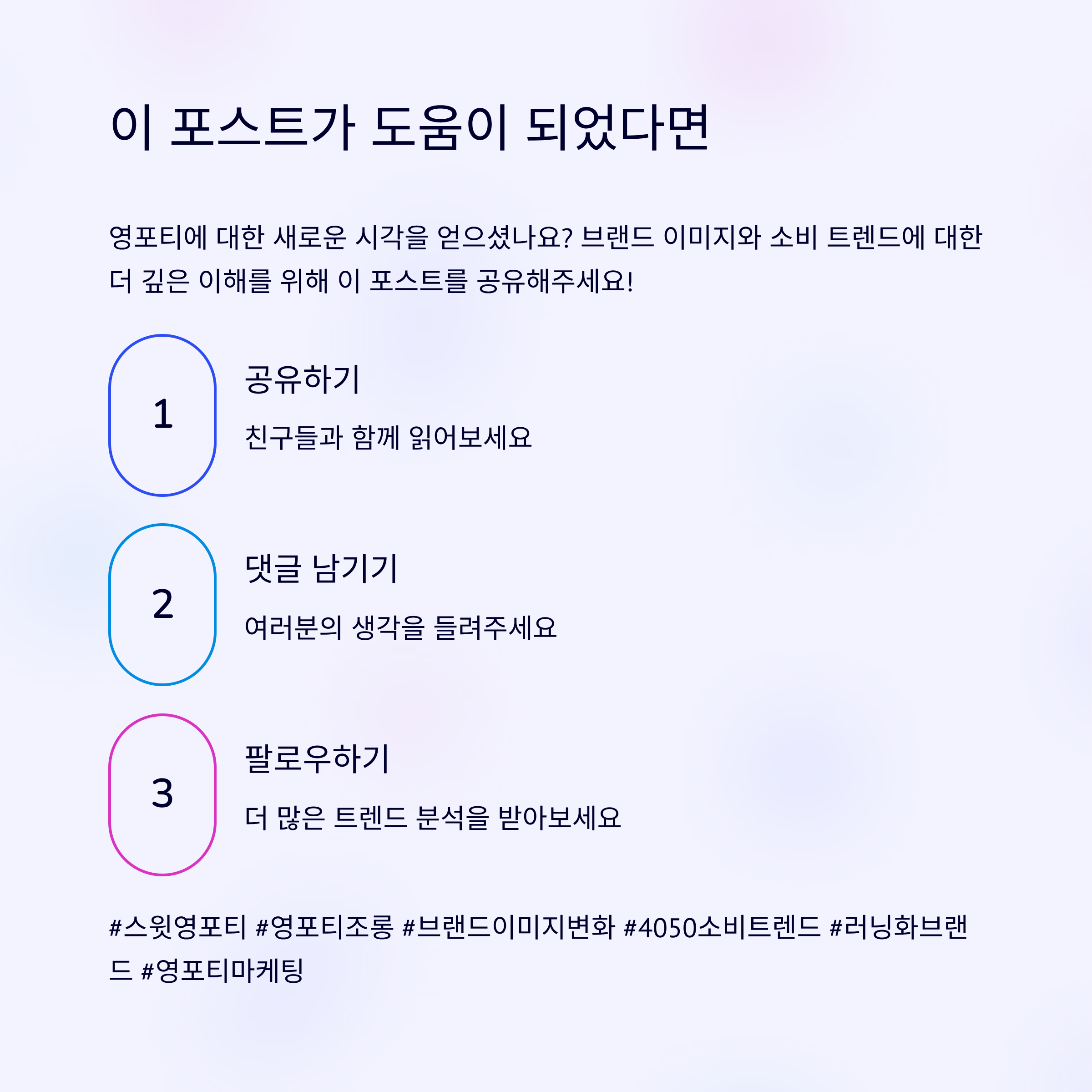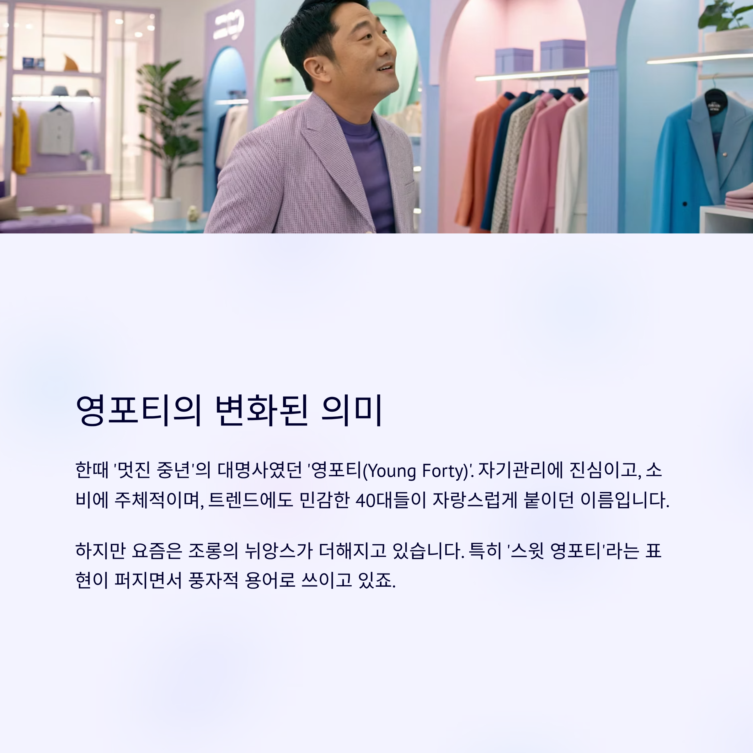 한때 ‘멋진 중년’의 대명사였던 ‘영포티(Young Forty)’. 자기관리에 진심이고, 소비에 주체적이며, 트렌드에도 민감한 40대들이 자랑스럽게 붙이던 이 이름에 요즘은 조롱의 뉘앙스가 더해지고 있습니다. 특히 ‘스윗 영포티’라는 표현이 퍼지면서 풍자적 용어로 쓰이고 있죠. 이번 글에서는 ‘영포티’라는 말의 변화, 조롱받는 이유, 브랜드 이미지에 미치는 영향, 그리고 진짜 문제는 무엇인지 짚어봅니다.