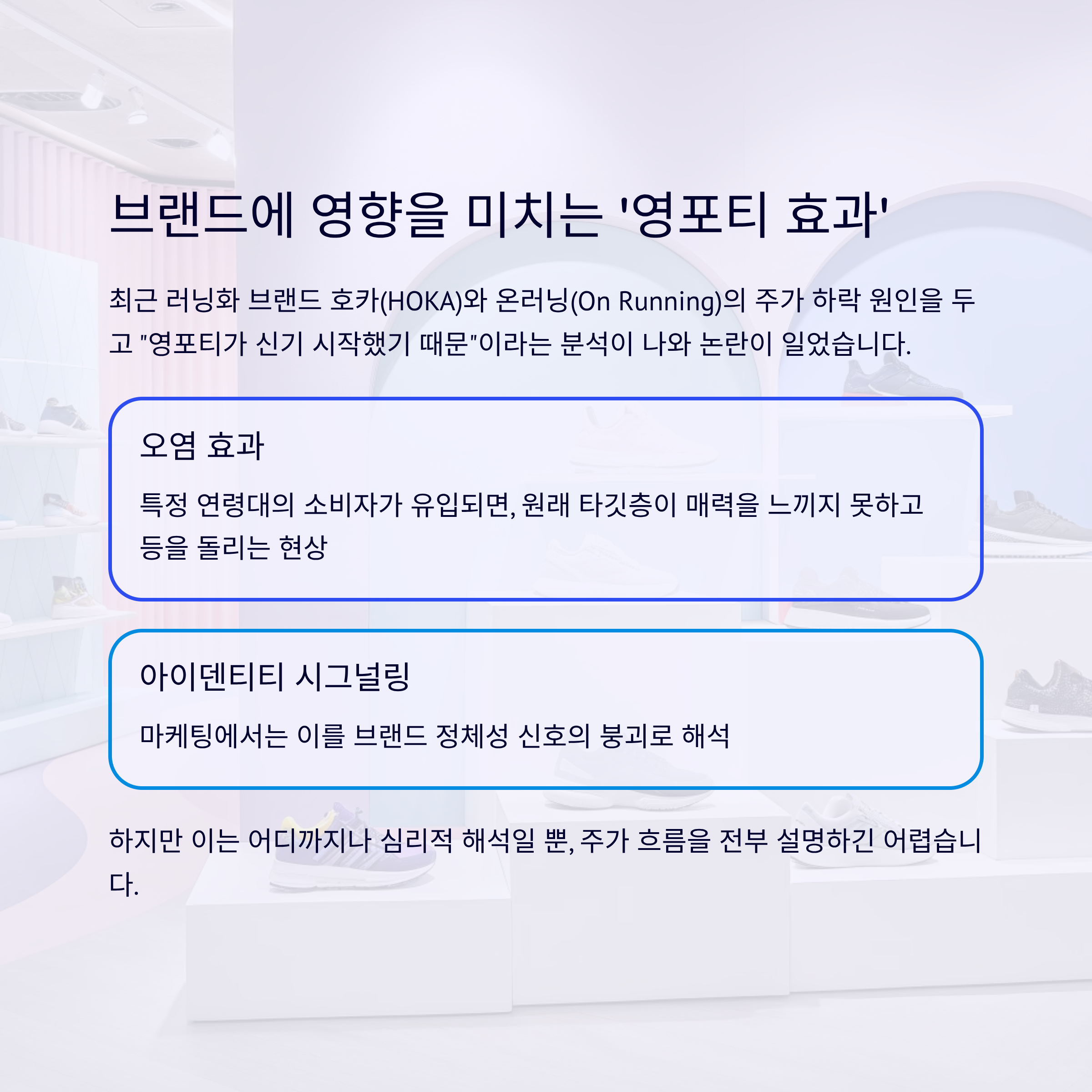 최근 러닝화 브랜드 호카(HOKA)와 온러닝(On Running)의 주가 하락 원인을 두고 “영포티가 신기 시작했기 때문”이라는 분석이 나와 논란이 일었습니다.