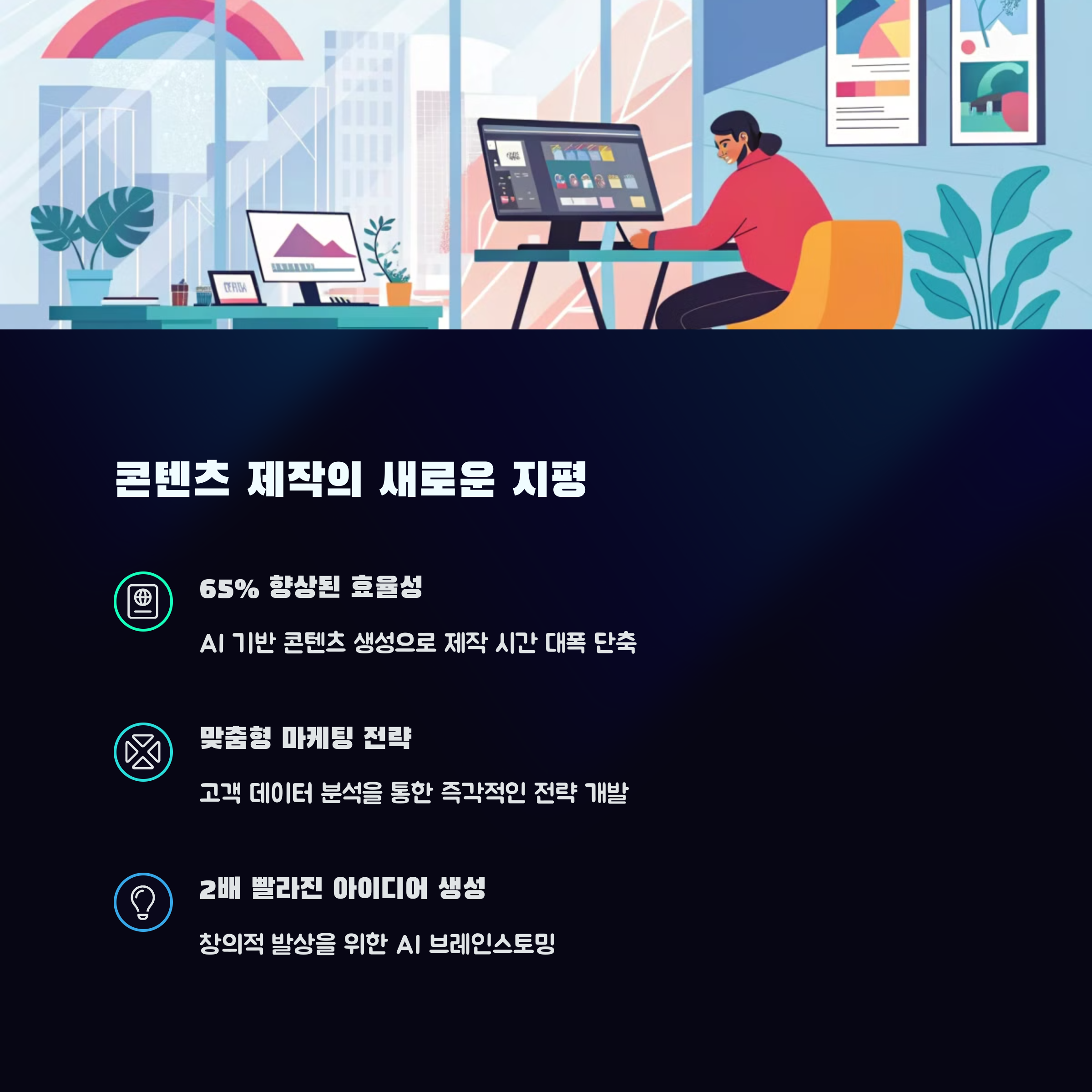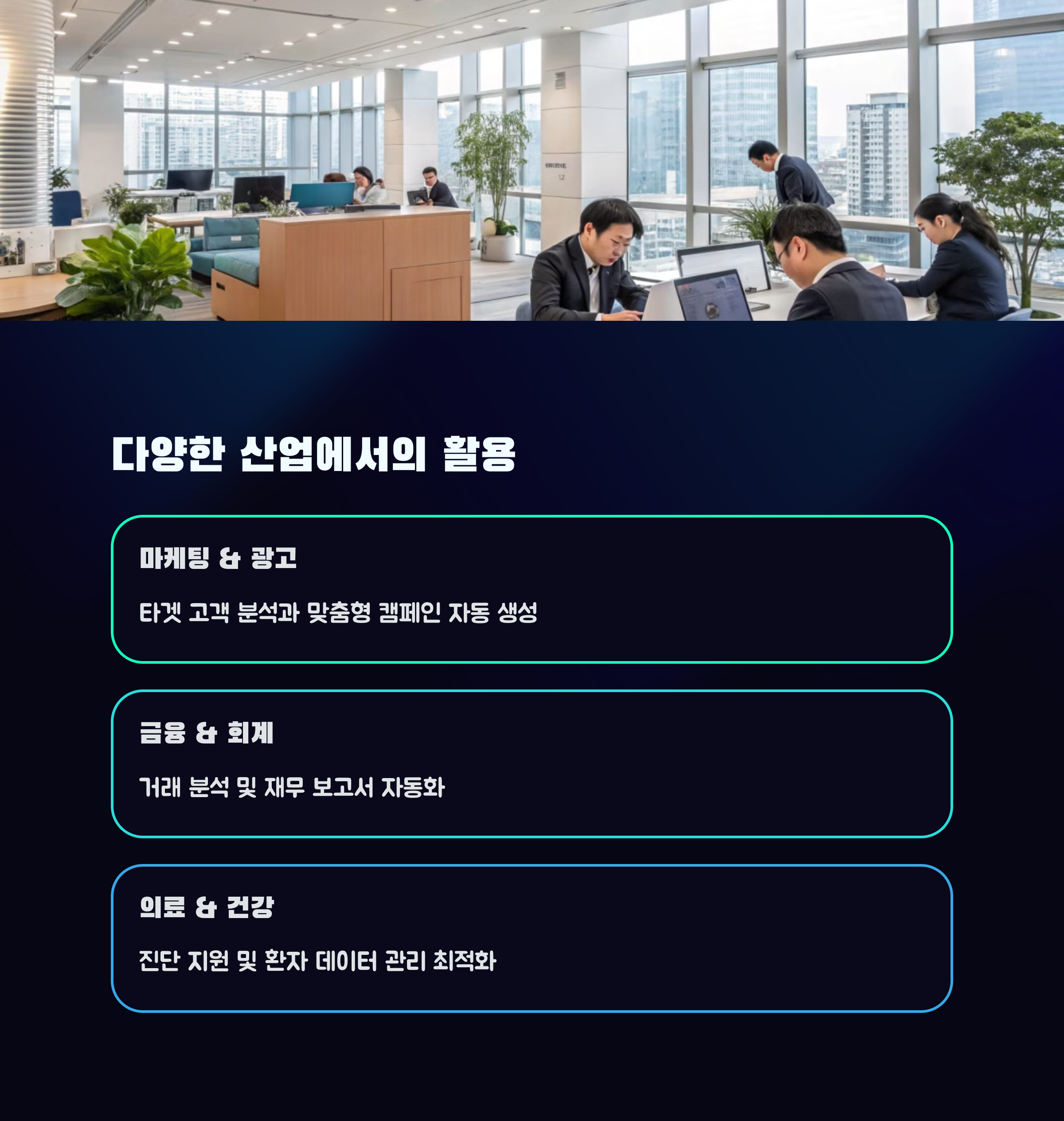 | 다양한 산업 분야에 적용 가능합니다. | AI가 실질적인 비서처럼 작동합니다. | 창의성과 전략 구상에 집중할 수 있습니다. |